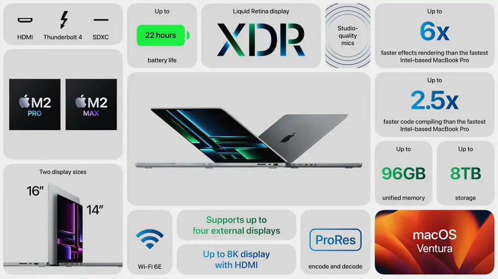 Macbook Pro 14 2023 M2 – представитель семейства ноутбуков, выведенных на рынок производителем Apple в начале 2023 года. Имеет схожий с предшественниками дизайн, но более производительные чипы M2 Pro и M2 Max.